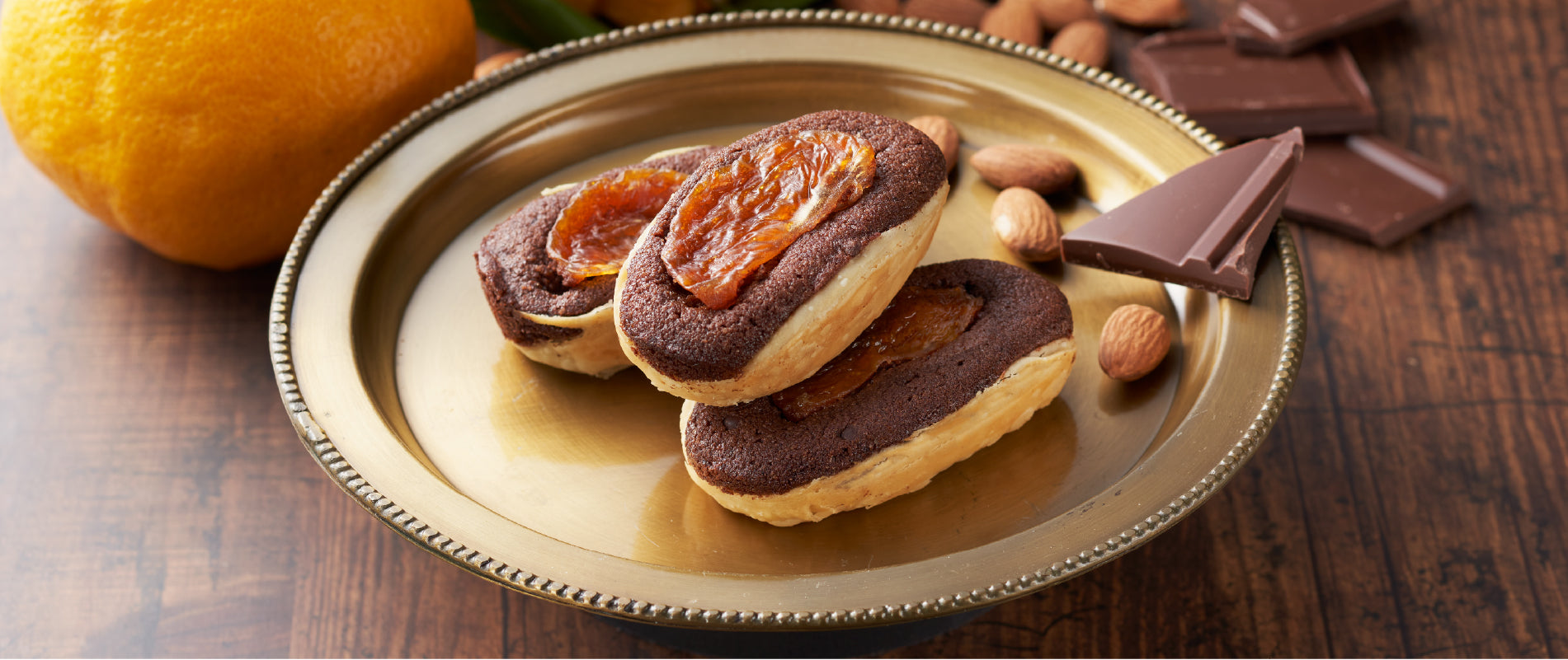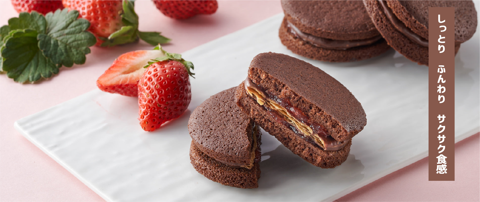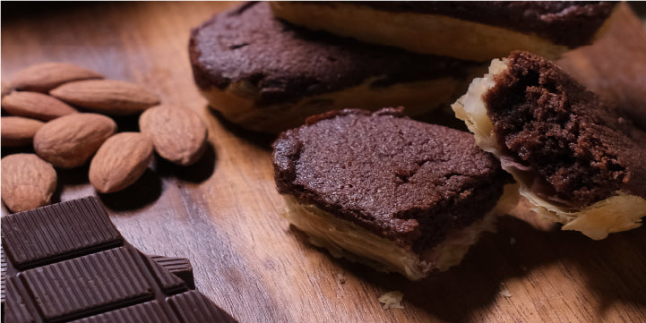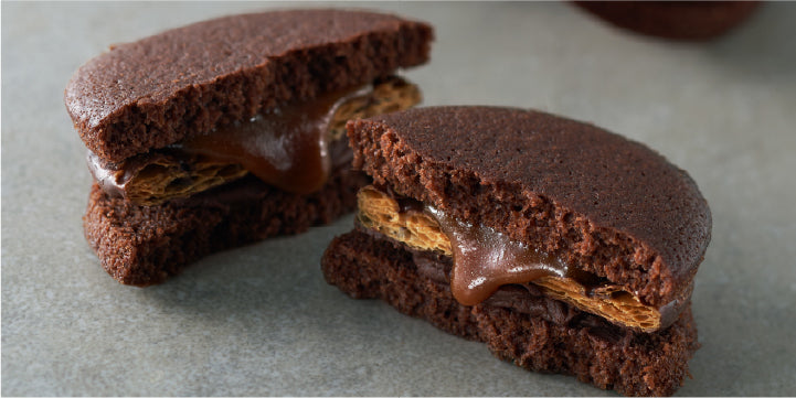ショコラフリアン生地にはクーベルチュールチョコレートを加え、しっとり・ふんわりとした食感にしました。中にはスイートチョコでコーティングしたサクサクのパイ生地、クーベルチュールのガナッシュクリーム、ほろ苦い自家製キャラメルをサンドしています。