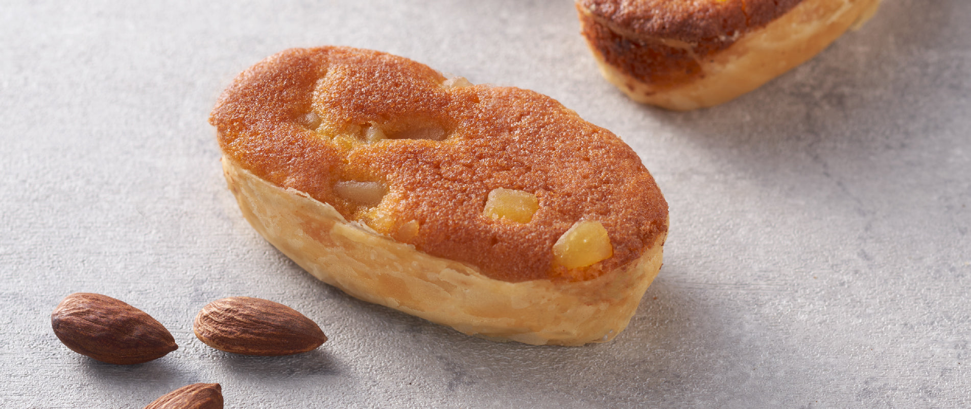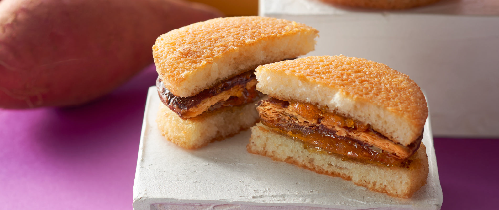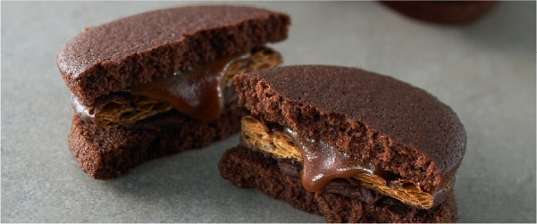 ショコラフリアン生地にはクーベルチュールチョコレートを加え、しっとり・ふんわりとした食感にしました。中にはスイートチョコでコーティングしたサクサクのパイ生地、クーベルチュールのガナッシュクリーム、ほろ苦い自家製キャラメルをサンドしています。
