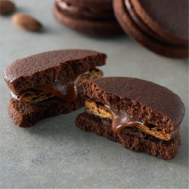 ショコラフリアン生地にはクーベルチュールチョコレートを加え、しっとり・ふんわりとした食感にしました。中にはスイートチョコでコーティングしたサクサクのパイ生地、クーベルチュールのガナッシュクリーム、ほろ苦い自家製キャラメルをサンドしています。