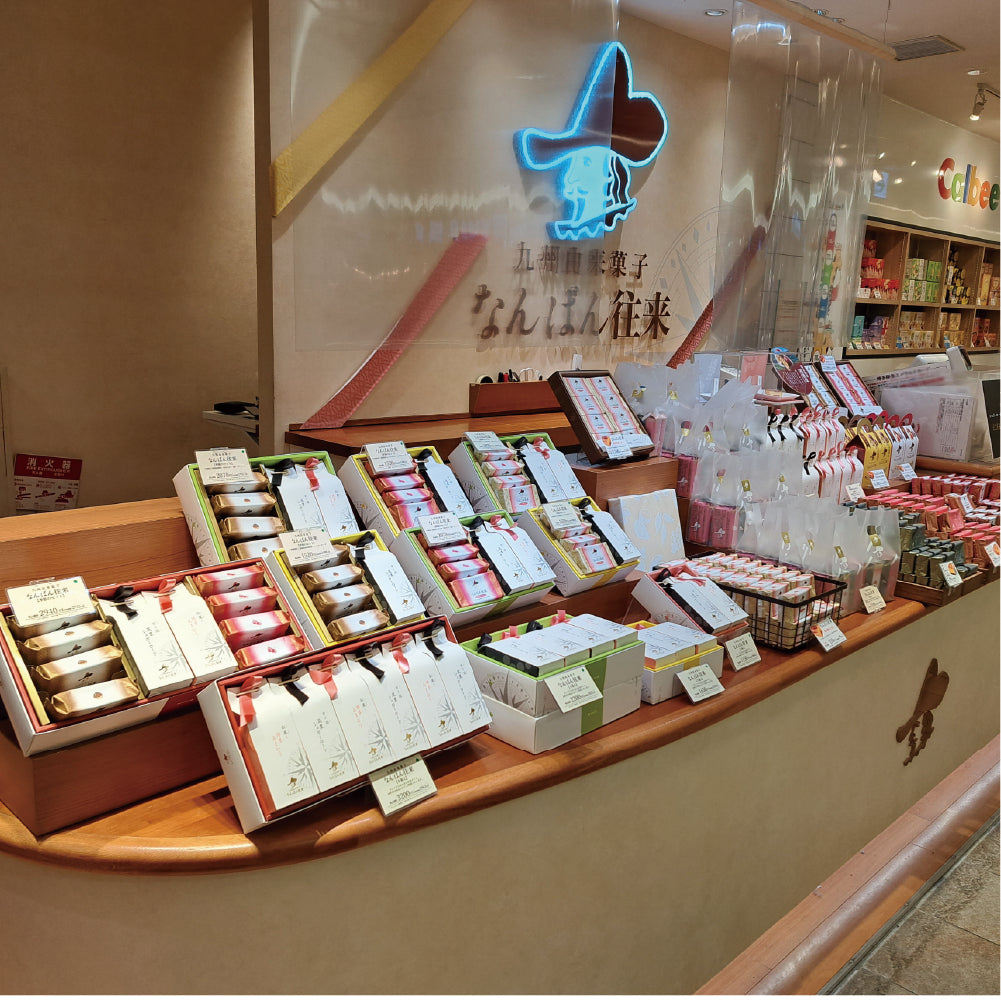 お店は便利な博多駅のマイング名店街にあり、帰省や観光のお土産を幅広く取り揃えております。「焼きたてなんばん往来」をはじめ、「なんばん往来」「なんばんサンド」のギフトやお土産商品も発売しております。